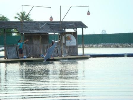 Show si lumba - lumbanya juga sangat kurang, tidak seperti yang dimiliki Ancol. Di Ancol show kita dikemas dalam sebuah cerita dimana si lumba - lumba ini menjadi tokoh utamanya sehingga show ini terlihat menjadi hidup, layaknya kita menonton drama diatas panggung. Sedangkan yang di Sentosa Island, lumba - lumbanya hanya diberikan perintah saja. Sedangkan moment yang paling ditunggu adalah atraksi berenang bersama lumba - lumba, inilah yang saya tunggu. Caranya, penonton diminta angkat tangan bagi yang minat berenang dengan si lumba - lumba, setelah itu pelatih akan memilih dua orang penonton yang beruntung. Satu penonton anak - anak satunya lagi penonton dewasa. Sayang saya tidak terpilih, jangan kecewa dulu....karena masih ada kesempatan kok untuk bisa berenang bersama lumba - lumba setelah selesai shownya hanya kita harus bayar hehehehe....yach mending di Bali aja deh bermain dengan lumba - lumbanya, lebih banyak pula.