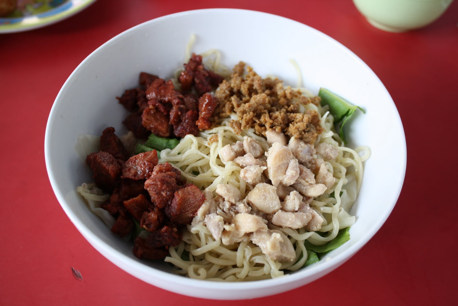 Untuk menu porsi Cowok memang lebih banyak mie nya ditambah dengan hamparan toping dengan 3 macam daging yaitu ayam asin, babi merah, babi cincang plus 3 biji pangsit, Nah ini namanya porsi Cowok Spesial. Kalo Cewek Spesial porsinya 1/2 dari porsi Cowok. Itulah yang membuat banyak orang penasaran dengan mie ini. Rasanya....untuk ini balik ke selera masing - masing. Bagi saya ini mienya gaya manis dan yam mienya pun tidak terlalu berlemak.